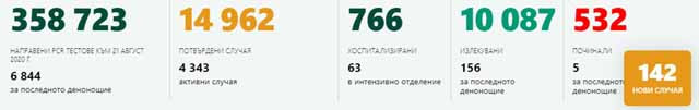 142 са новодиагностицираните с COVID-19 лица през последното денонощие. PCR тестовете, направени през изминалите 24 часа, са 6844.