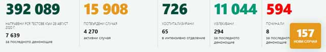 У нас към момента са доказани общо 15908 случая на новия коронавирус, от които 4270 са активни. Излекуваните лица са 11044. От тях 294 са регистрирани през последното денонощие.