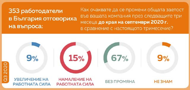 Българските работодатели предвиждат слаб пазар на труда в периода юли-септември според публикуваното днес Обзорно изследване на ManpowerGroup за заетостта. Проучването, което беше проведено по време на извънредните обстоятелства на епидемията от COVID-19, разкрива, че 9% от работодателите в страната планират да увеличат броя на служителите, 15% предвиждат да го намалят и 67% не очакват промяна в нивата на заетост. След корекция на данните според сезонните колебания отчетената нетна прогноза е -7% и е най-слабата от началото на изследването преди повече от девет години. Въпреки това 22% от работодателите очакват през следващите три месеца да се върнат към нивата на наемане на нови служители отпреди епидемията, като тези от сектор „Друго производство” са най-оптимистични (27%).