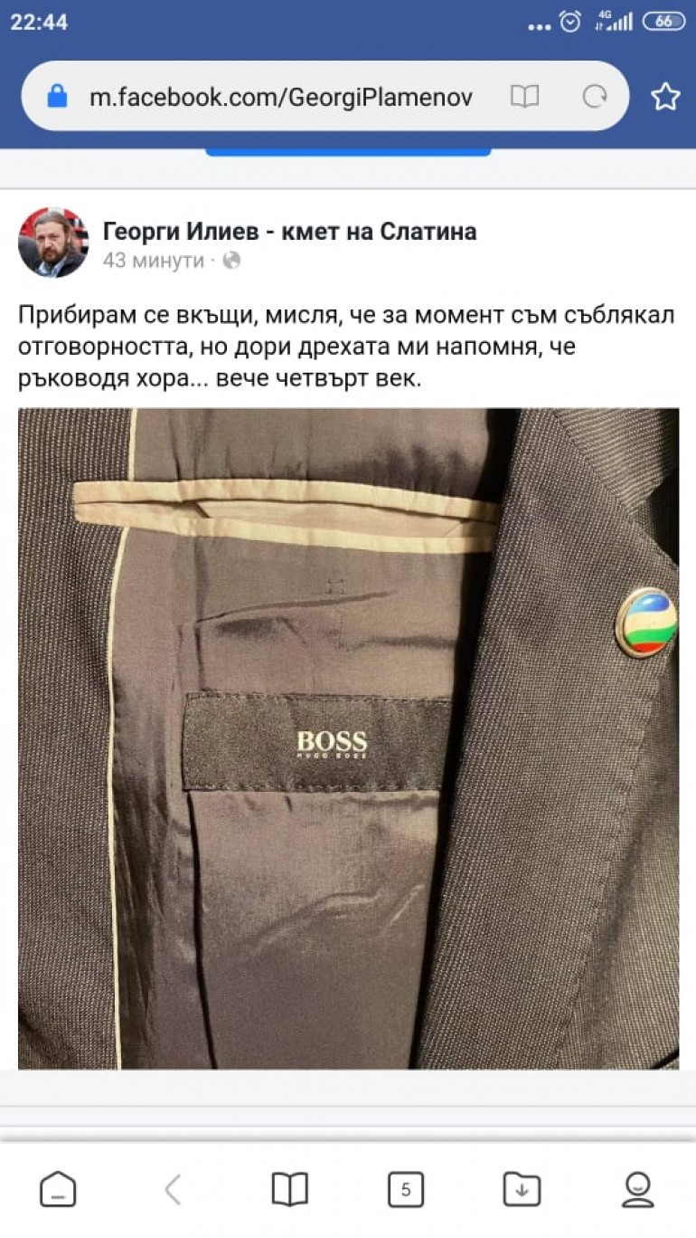 Кметът на столичния района „Слатина“ Георги Илиев с ново откровение на страницата си във Фейсбук. Той разпространи снимка на сакото си с марка „ Hugo Boss“ и написа: