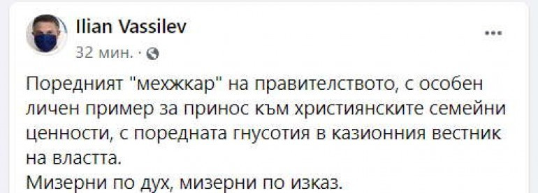 „Задкулисието винаги се е опитвало да контролира празидентите* (вероятно има предвид президентите) и тормозеше чрез медии и служби членовете на семействата им. И съпруги, и деца, и родители. Радев не само не прави изключение, но и стана притегателен център на атаките ми. … Най-глупавото е, че само вдигат подкрепата за Радев и зорлем го преръщат* (превръщат или може би прегръщат) в своя антитеза“, анализира Василев.