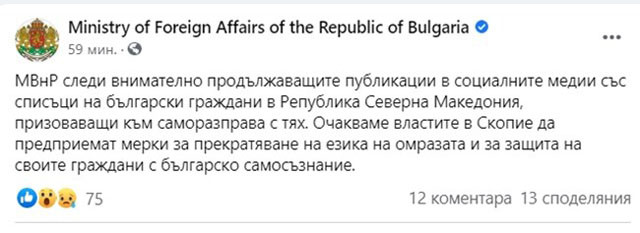 "МВнР следи внимателно продължаващите публикации в социалните медии със списъци на български граждани в Република Северна Македония, призоваващи към саморазправа с тях.