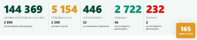 Новодиагностицираните с COVID-19 лица през последното денонощие са 165 - само с един по-малко от рекордните до момента 166, отчетени на 26 юни. Извършени са 2896 PCR тестове през изминалите 24 часа.