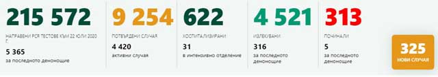 325 са новодиагностицираните с коронавирусна инфекция лица за изминалите 24 часа, което е само с 5 по-малко от рекордните 330, регистрирани на 10 юли. Извършени са 5365 PCR теста през последното денонощие. Това сочат данните в Националната информационна система.