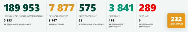 232 са новодиагностицираните с COVID-19 лица през изминалите 24 часа. За последното денонощие са направени 5393 PCR теста. Това сочат данните в Националната информационна система. Изразено в относително съотношение, положителните тестове съставляват 4,3% от всички изследвани за денонощието проби.