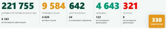 330 са новодиагностицираните с COVID-19 лица за последното денонощие. Точно толкова бяха регистрирани и на 10 юли и тази стойност на броя положителни тестове, отчетени за едно денонощие, засега е рекордна. Направените PCR тестове за изминалите 24 часа са 6183. Това показва Националната информационна система.