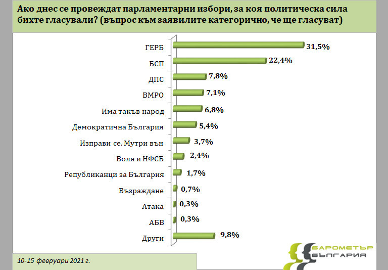 При избирателна активност от 34,6%, формирана от твърдите ядра, първа политическа сила ще остане ГЕРБ с подкрепата на 31,5% от гласуващите. БСП ще се нареди на второ място с 22,4%, а ДПС ще се наредят на трето място със 7,8%.