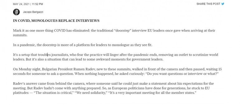 В статията се отбелязва, че покрай COVID е спряла практиката лидерите да се дават традиционни интервюта преди влизане на срещи на върха.