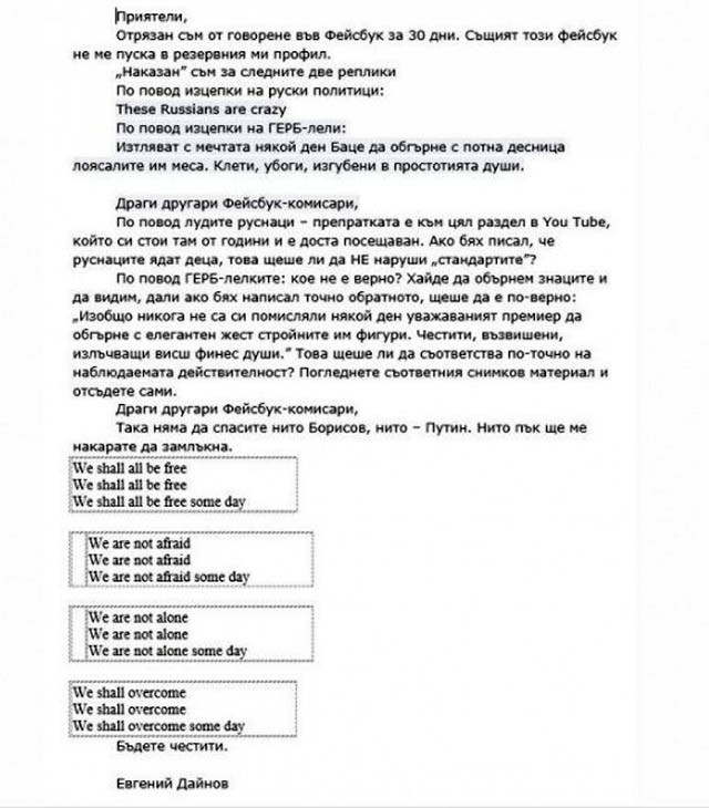 В заключение Дайнов се обръща към „Фейсбук комисарите“ с думите, че така нито ще спасят Путин, нито Борисов, а още по-малко ще го накарат да млъкне.