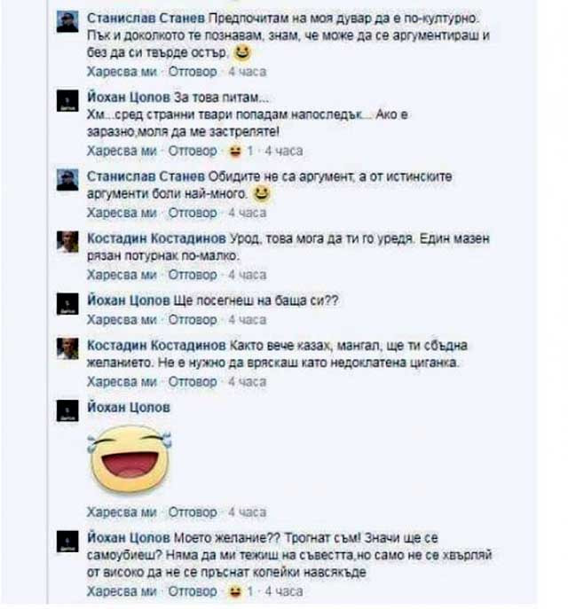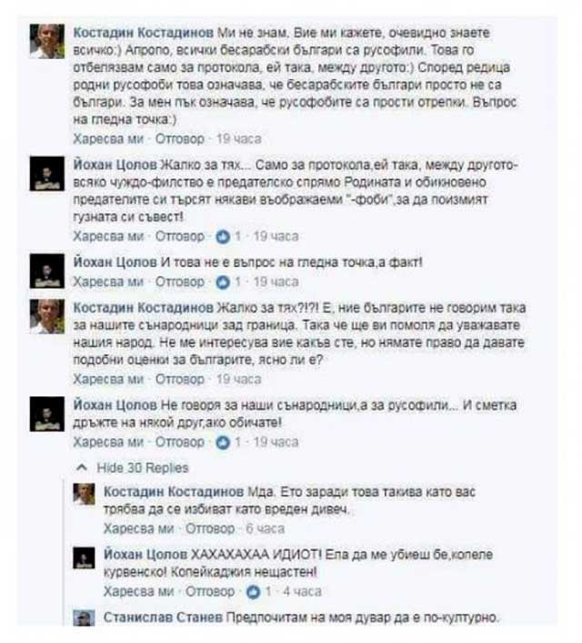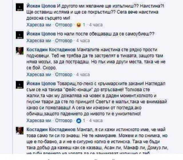 Въпреки отправените от останалите участници в дискусията молби за запазване на добрия тон, зовящият за мъст и саморазправа русофил допълнително изостря реториката. Агресивното поведение достига до крайност, когато опонентът на Костадинов бива заплашен с физическа саморазправа. Към жертвата на недопустимия за едно демократично общество език на омразата, са отправени редица обидни епитети на религиозна и етническа основа. „Мангалите наистина сте рядко прости подчовеци. Теб не трябва да те застрелят в тиквата, защото там няма мозък, за да пострадаш. Но пък има други места, така че не се бой. Скоро“, споделя заплашително в един от коментарите си Костя. От словесната престрелка става ясно, че изрази като „мангал“, „недоклатена циганка“ и „мазен рязан потурнак“ са част от речника на видния „възрожденец“.