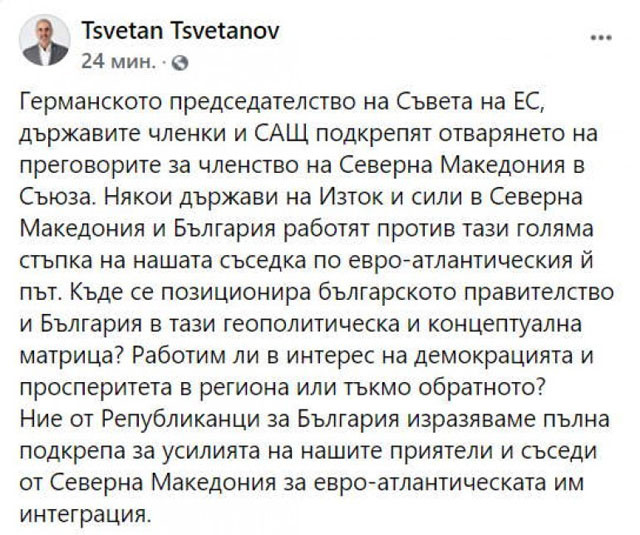 В същото време лидерът на ПП „Републиканци за България“ Цветан Цветанов категорично се обяви за „пълна подкрепа за усилията на нашите приятели и съседи от Северна Македония за евро-атлантическата им интеграция.“/tribune.bg