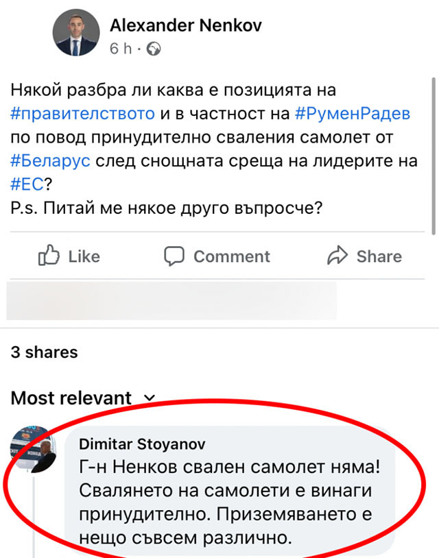 „Някой разбра ли каква е позицията на правителството и в частност на Румен Радев по повод принудително сваления самолет от Беларус след снощната среща на лидерите на ЕС? P.s. Питай ме някое друго въпросче?“, написа в личния си фейсбук профил Александър Ненков.