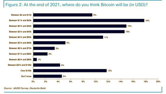 За да види къде ще се намира криптовалутата догодина обаче, от банката осъществиха анкета сред клиентите си. На фона на килимната бомбардировка от експлозивни прогнози за цената на криптовалутата обаче, потребителите на услугите на най-големият кредитор в Германия може да дойдат доста изненадващи.