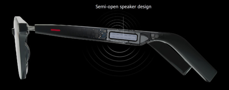 В рамките на очилата са скрити говорители, чиято архитектура не позволява на звука да изтича навън и влиза директно в ухото.