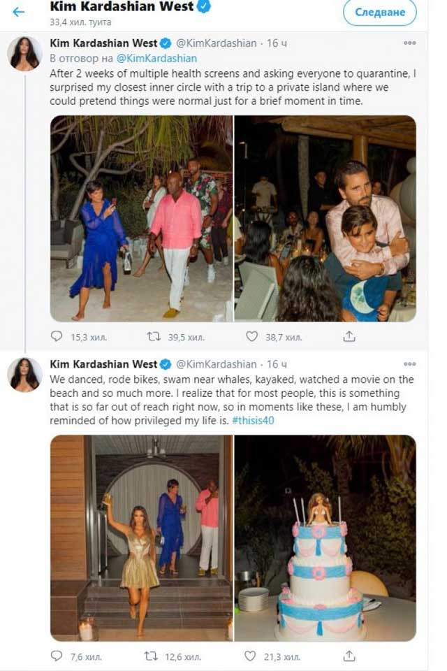 „След две седмици множество изследвания и молба за карантина изненадах най-близките си хора с пътуване до частен остров, където можехме да се преструваме поне за малко, че нещата са нормални. Танцувахме, карахме колела, плувахме близо до китове, каяк, гледахме филм на плажа и т.н. Осъзнавам, че за повечето хора това е нещо, което сега далеч не е на дневен ред, така че в моменти като тези ми се напомня колко привилегирован е животът ми“, споделя Ким Кардашиян.