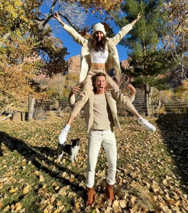 "Хвани ме, ако можеш" гласеше текстът към кадъра, на който 31-годишната актриса от "Дневниците на вампира" и сноубордистът са облечени в идентични тоалети, Нина е на раменете му на фона на слънчев есенен пейзаж.