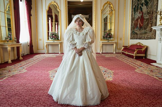 Един от ключовите моменти в новия сезон на The Crown ще бъде кралската сватба на Даяна и принц Чарлз. Специално за нея е изработена реплика на сватбената рокля от копринена тафта с шлейф, дълъг 7.6 метра. Дизайнерите Дейвид и Елизабет Еманюел работят по нея с помощта на 20 шивача. Резултатът е изключително близък до оригинала.