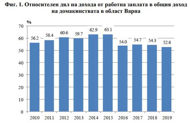В структурата на общия доход в област Варна с най-висок относителен дял е работната заплата. През 2019 г. той е 52.6%, което е с 1.7 процентни пункта по-малко в сравнение с 2018 г. и с 3.6 процентни пункта - спрямо 2010 година.