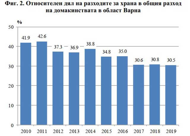 През 2019 г. относителният дял на разходите за храна от общия разход в област Варна е 30.5%, което е с 0.3 процентни пункта по-малко в сравнение с 2018 г. и с 11.4 процентни пункта - спрямо 2010 година.